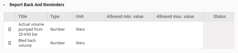 The purpose of Report back and reminders is to allow for the plan author to request certain values to be reported back in the execution phase as well as defining checks that should be completed during that step. Report Back and Reminders are defined by a title, a type, a unit and an allowable min. and max. value (not required).
