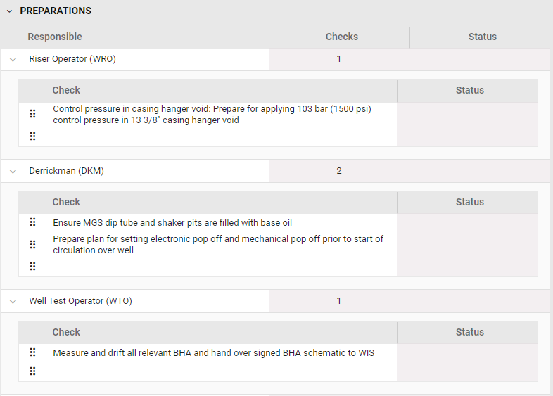 In RigBridge, Preparation Checks are organized by Responsible roles. The list of roles is fixed and corresponds to the user roles in RigFlow. The Preparation Checks are entered as simple text strings. No formatting is available in these fields.